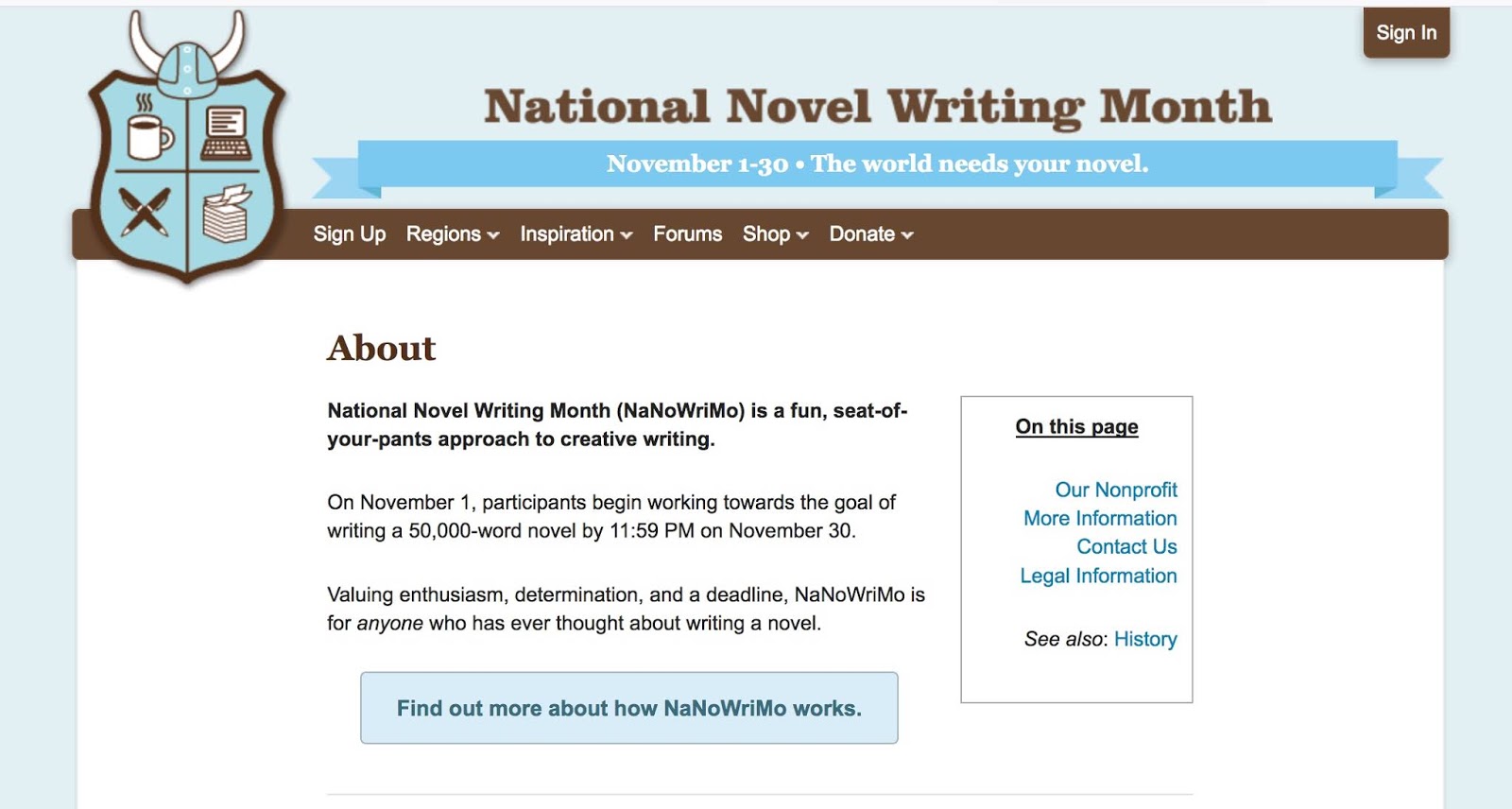 Anyone who manages to complete a novel this month will earn no less than a B on the semester report card. More details at the website: https://nanowrimo.org/about